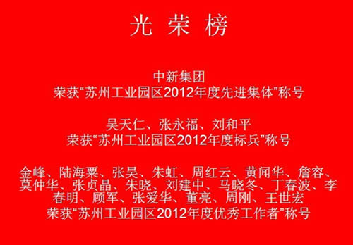 2月17日,苏州工业园区召开2012年度总结表彰大会,对先进集体和先进个人予以表彰。省委常委、市委书记蒋宏坤,市委副书记、市长周乃翔,市人大常委会主任杜国玲,市政协主席高雪坤,市委常委、市委秘书长王少东,市委常委、园区工委书记王翔等出席了表彰大会。