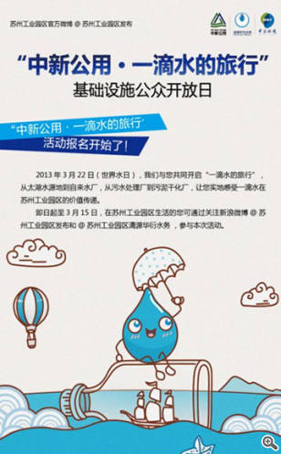 2013年3月起,中新苏州工业园区市政公用发展集团有限公司(简称“中新公用”)联合苏州工业园区宣传(精神文明)办通过园区官方微博@苏州工业园区发布 招募有兴趣的粉丝,邀请公众参加基础设施公众开放日之“一滴水的旅行”活动。