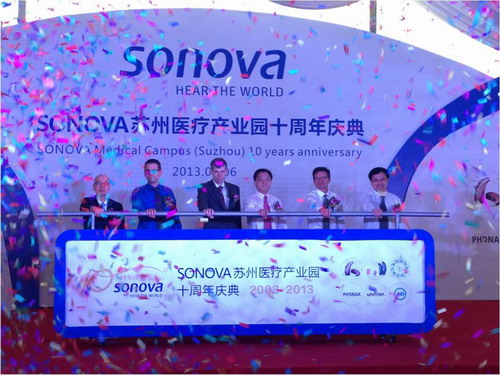 2013年9月6日,Sonova苏州医疗产业园10周年庆典在苏州工业园区举行。作为全球听力保健系统的领跑者,瑞士Sonova集团自2003年落户园区以来,在园区管委会的大力支持下, 在社会各界的倾力帮助下,不断发展持续壮大。集团于2009年自建新厂房,年产助听器240多万台,成为集团全球最大的生产基地,并有力助推了园区医疗产业的发展。