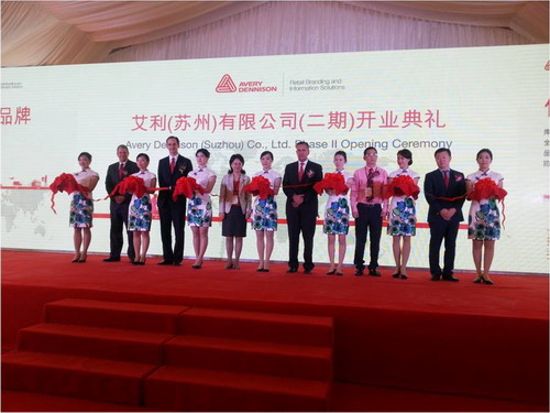 2013年10月18日,艾利丹尼森苏州工厂二期项目隆重举行开业典礼,苏州工业园区管委会副主任孙燕燕女士、艾利丹尼森零售品牌和信息解决方案部总裁Shawn Neville先生等领导出席了本次典礼。