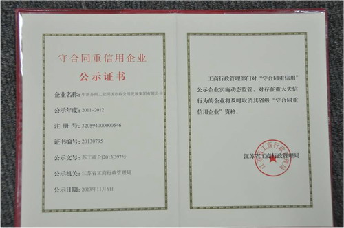 “守合同重信用企业”是各级人民政府或工商行政管理机关授予合同与信用管理工作卓有成效、市场交易行为诚实信用、全员信用意识强、经济效益较好的企业的信用荣誉称号。中新公用自2008年开展“守合同重信用”申报工作。获得区级称号以来,公司建立和完善内部信用管理制度,规范合同的签订与履行,防范合同交易风险,有效提高了企业信用管理水平。在江苏省2011~2012年度“守合同重信用企业”申报中,中新公用与园区内其他15家企业获此省级殊荣。