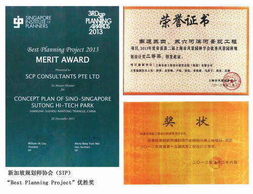 2013年11月28日,由中新苏通公司管理、新加坡邦城规划顾问公司(SCP)主持设计、与新加坡市区重建局(URA)联合完成的“苏通科技产业园概念规划”在新加坡规划师协会(SIP)大奖评比中,获颁“Best Planning Project”优胜奖。SIP大奖每两年举办一次,旨在推进城市规划并将规划作为专业领域促其发展,表彰新加坡城市规划与咨询公司在国内外设计的优秀项目。