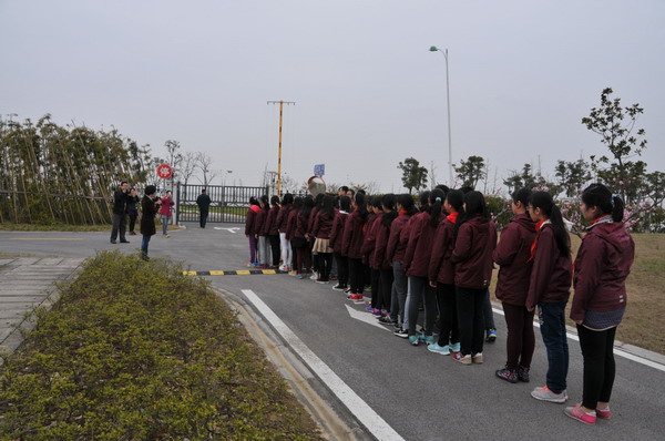 同学们列队接受安全教育,对面门外就是浩淼的阳澄湖,也是水厂的水源地。