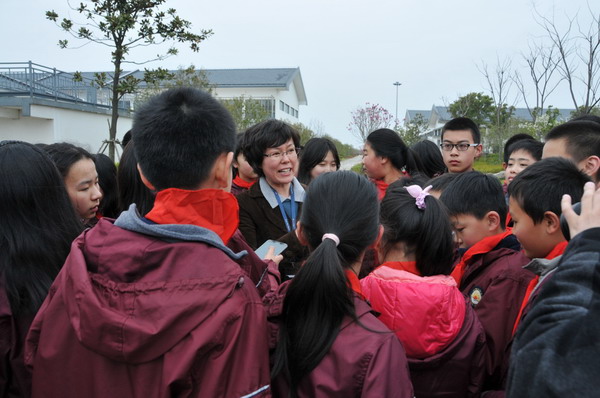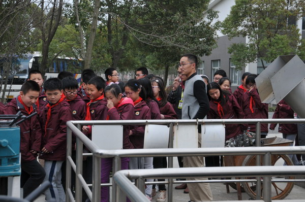 自来水厂参观结束后,好学的同学们围住刘玉红副厂长问个不停。