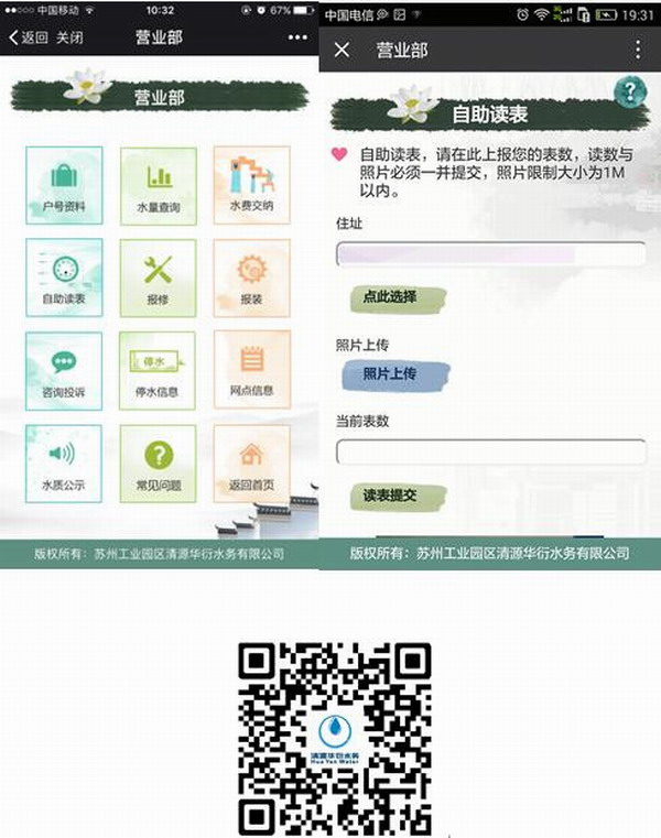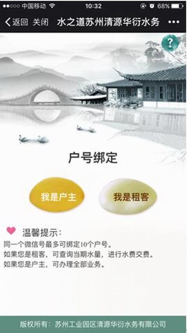 用户关注 “水之道苏州清源华衍水务”官方微信号,成功绑定户号后可在指定时间内将水表的读数拍照上传,输入相关数据,完成抄表。