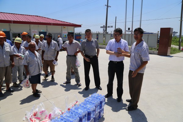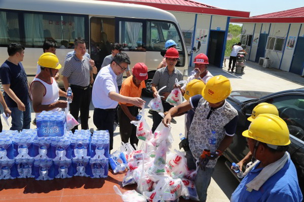 近日,中新苏通有关领导一行来到综保区B区、金英湖周边等基础设施工地现场,看望慰问酷暑期间坚守岗位的一线工人,为他们送去毛巾、清凉油等夏日防暑降温用品,并对工人们为项目建设作出的贡献表示感谢。 中新苏通要求施工单位要本着“以人为本”的宗旨,合理安排工作和休息时间,采取各种切实有效的措施,做好夏季高温期间的施工,抓好工人安全生产及各种后勤保障工作,确保工人兄弟身体健康。施工中要做好安全防范和突发事件的应急应对工作,确保一线工人度过一个安全、卫生、清凉的夏季。