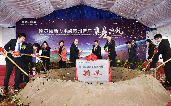11月28日,德尔福动力系统苏州新厂在苏州工业园区开工奠基。新工厂共占地84亩,一期总建筑面积16700平米,二期生产车间建筑面积为6000平米。一期项目预计将于2019年1月正式投产使用。新工厂主要为国内主要的汽车厂商提供关键的新能源零配件,以期更好地实现本地化服务。园区党工委副书记、管委会主任周旭东,园区党工委委员、统战部部长孙燕燕,中新集团董事长赵志松,德尔福动力总成全球副总裁Kevin Quinlan等出席奠基仪式。