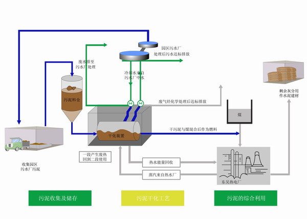 项目选址于苏州东吴热电有限公司厂区内, 紧邻园区第二污水处理厂,最大程度的缩短了脱水污泥和干污泥的运输距离。污泥厂利用热电厂的余热蒸汽和污水厂产生的中水干化污水厂产生的污泥,干化后的污泥作为生物质能用于热电厂焚烧发电,产生的蒸汽冷凝水回到热电厂作为锅炉补给水循环利用,焚烧产生的灰渣作为建筑辅材;生产过程中产生的污水排回污水厂进行处理后达标排放,实现了污泥厂、污水厂与热电厂之间资源共享、协同发展。