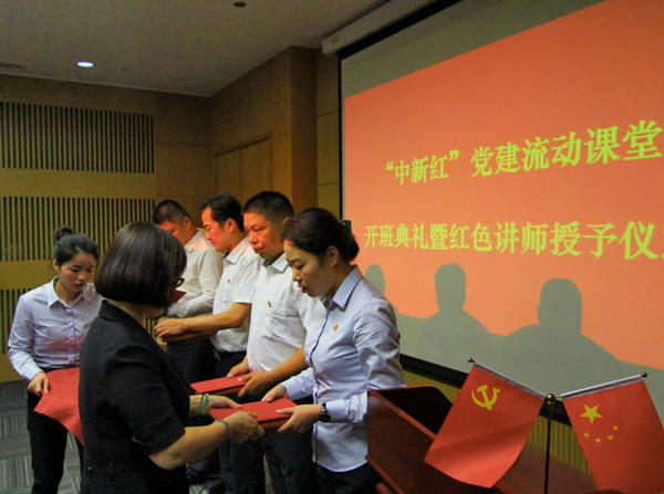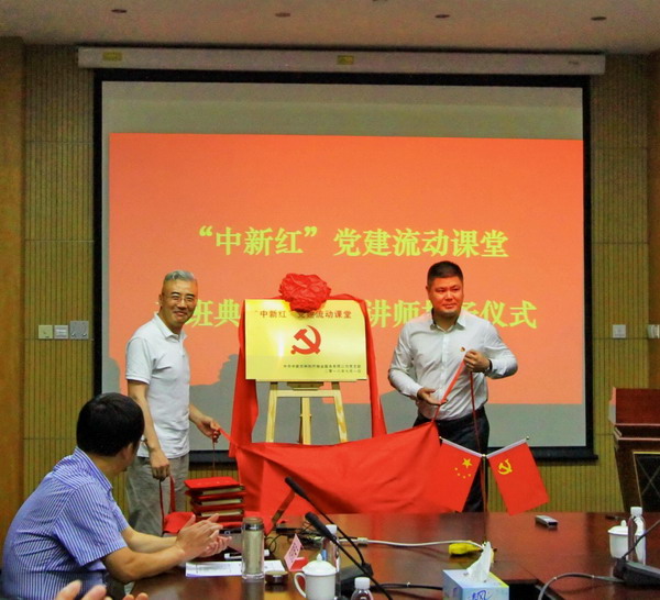 近日,中新集团党委和乔物业支部“中新红”党建流动课堂开班典礼暨红色讲师授予仪式在中新生态科技城展业大厦举行,中新置地党总支委员费子放、张磊共同为“党建流动课堂”揭牌,中新和乔物业副总经理蔡雅红为四位讲师颁发荣誉聘书。