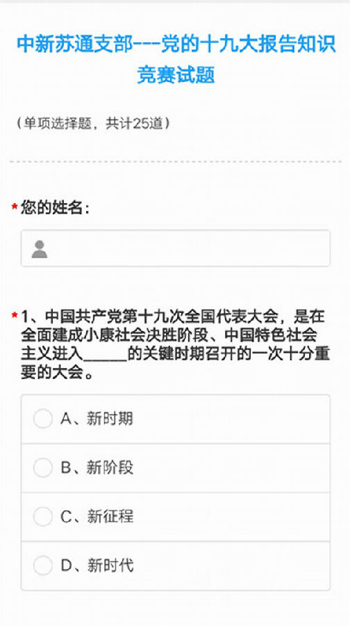 7月20日,中新苏通支部组织开展学习十九大报告知识竞赛。通过创新测试载体,分享试题链接,以无纸化答题,自动生成排名和成绩的形式,把枯燥的理论知识和活泼的比赛形式结合起来,充分调动了支部党员群众学习的积极性,达到了“以考促学、以学促做”的目的。