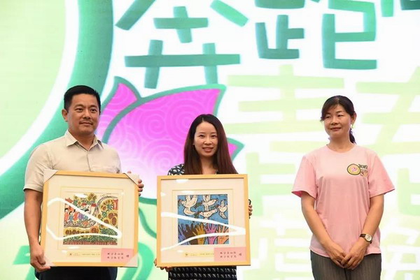 徐州市睢宁县妇联负责人林茹女士在现场将最具地方文化特色的睢宁儿童画赠与苏州工业园区慈善总会和爱心企业中新集团。