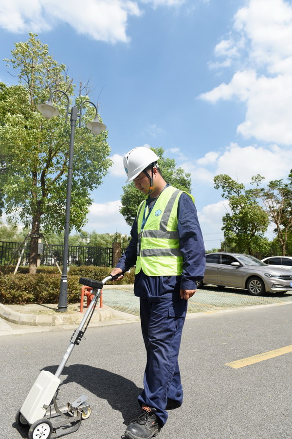 烈日下,苏州港华燃气有限公司巡线人员用脚步丈量城市道路,检查地下燃气管线安全。