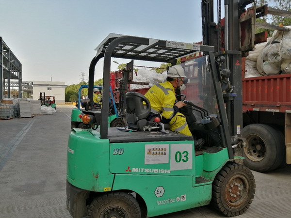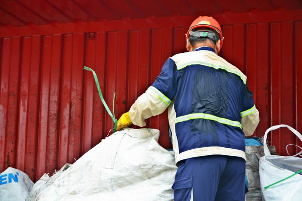 中新苏伊士环保技术(苏州)有限公司接收预处理小组正在将刚抵达的废料运回仓库。