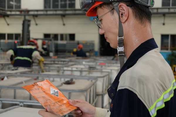 江苏和顺环保有限公司接收组正从危废运输车辆中搬运废料。