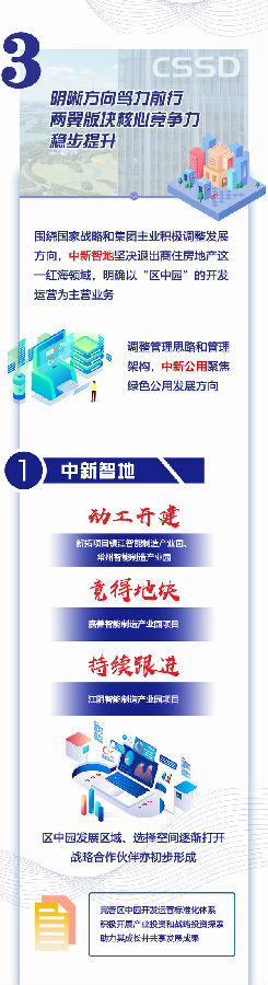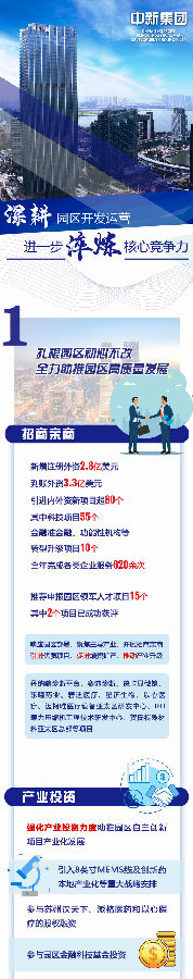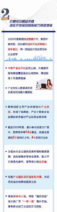 2021年,中新集团将全力聚焦园区开发运营,继续站在园区开发运营主体的高度上,不断深入理解、勇于承担主体的责任、使命和内涵,不断实践探索如何实现政治效益、社会效益、经济效益协调统一。充分完善、提升集团在项目拓展、规划建设、软件转移、招商亲商等四大节点核心竞争力,进一步深耕细作,补充强化产业投资和配套服务两大园区开发运营节点,以产为核、以人为本,打通堵点、补齐短板,构筑完整的园区开发运营全链条闭环。