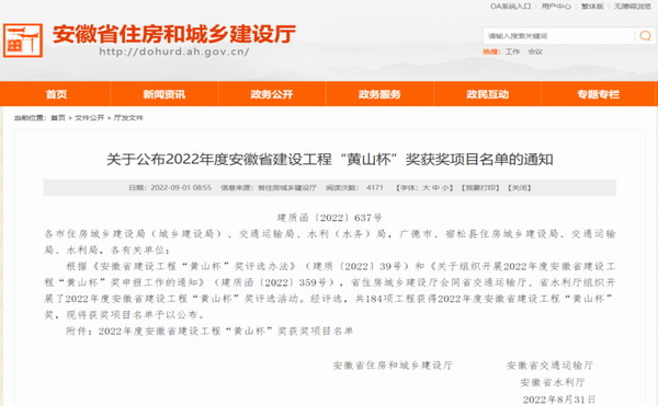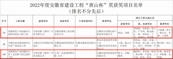 近日,安徽省住房和城乡建设厅公布了“2022年度安徽省建设工程‘黄山杯’奖获奖项目名单”。中新苏滁高新区滁州大道跨清流河大桥工程及滁州大道(友谊路-滨河北路)工程同时荣获安徽省建设工程最高奖项“黄山杯”奖。