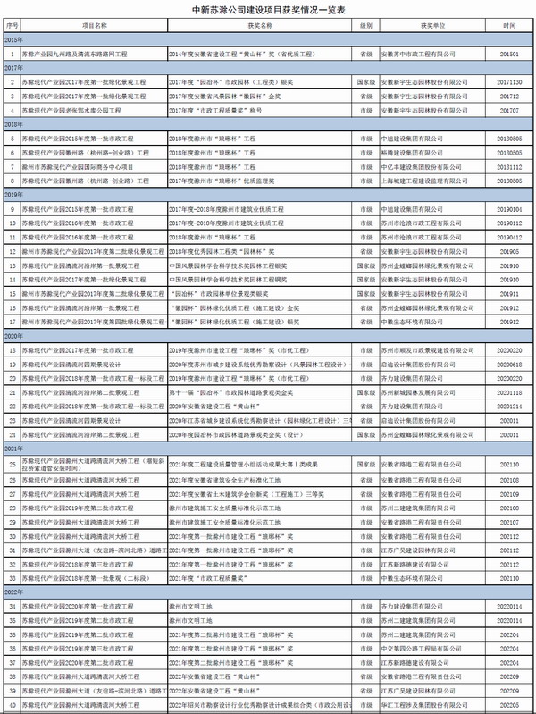 建区以来,中新苏滁坚持高标准建设,以创优为抓手,以重大项目为载体,致力打造滁州地标工程,展示城市建设形象,不断提升营商环境,取得了较好的政治、社会、经济效益。截至目前建设项目累计获得各类奖项40个,其中获得安徽省建设工程最高奖项“黄山杯”4个。